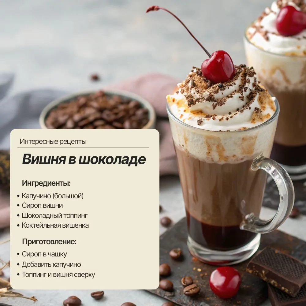 Рецепт на основе капучиноВишня в шоколаде — ароматный капучино с нежным вишнёвым сиропом, шоколадным топпингом и коктейльной вишенкой. Настоящее лакомство в каждой чашке!