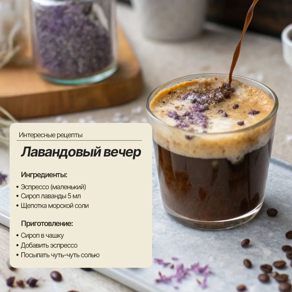 Рецепт на основе эспрессоЛавандовый вечер — ароматный эспрессо с тонкими цветочными нотами лаванды и лёгким морским акцентом. Чашка тишины и вдохновения.