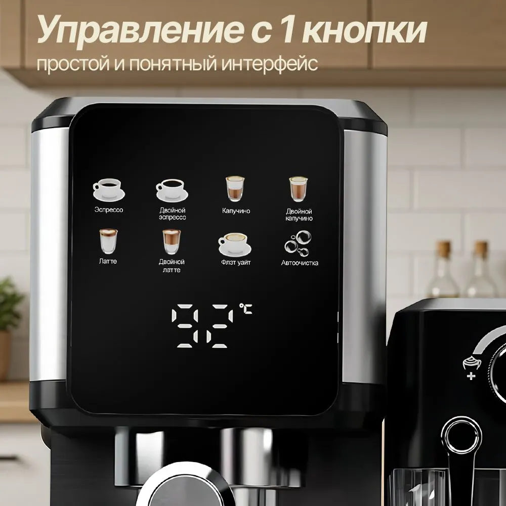 Простое управление и компактный размерБлагодаря своим компактным размерам, данная кофеварка легко впишется в любое пространство на вашей кухне. Интуитивно понятный интерфейс и простота в использовании позволяют легко управлять всеми функциями, даже если вы новичок в мире кофе. Просто выберите нужный режим, и кофемашина сделает всё за вас.