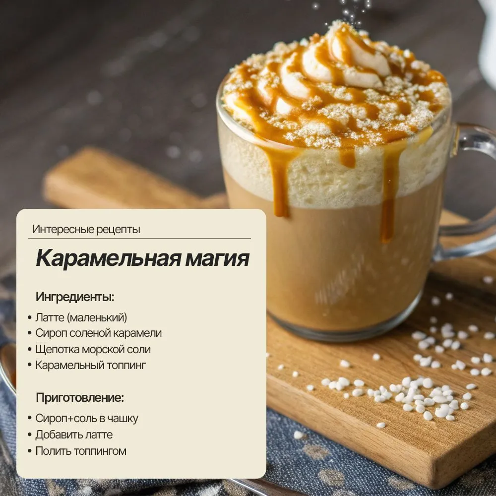 Рецепт на основе латтеКарамельная магия — тёплый латте с солёной карамелью, воздушными сливками и янтарным топпингом. Мгновение уюта в каждой чашке!