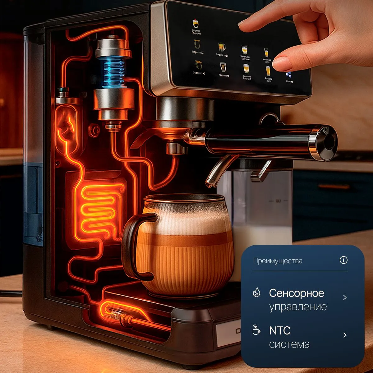 Сенсорное управлениеБлагодаря сенсорной панели и интеллектуальной системе NTC вы легко настроите температуру и плотность молочной пены под свои предпочтения