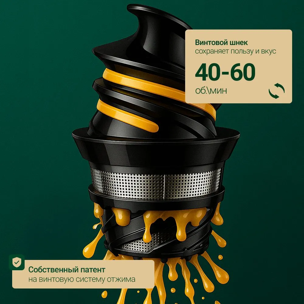 Винтовая система отжимаПлюс реверс-режим поможет избежать забивания и гарантирует полноценное извлечение сока даже из самых плотных ингредиентов
